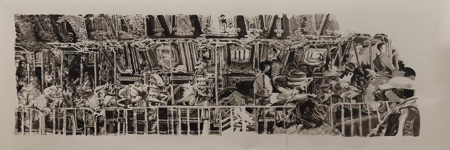 In the Extended Moments series, I invite the viewer to participate in my experience of cultural observation–personal experience within socio-political backdrops–focusing here on carousel and river imagery. Utilizing panoramic fields of vision as means to experience these environments, my paintings reflect a lens-based record of time both intimate and frozen; the images are fractured, incomplete, containing misrepresentations, and figures out of proportion–ink is subject to water and paper. Likewise, cultural experience, though replete with external facts and internal intuitions, is just beyond our control. My work contributes to understanding, which exists within a state of flow.